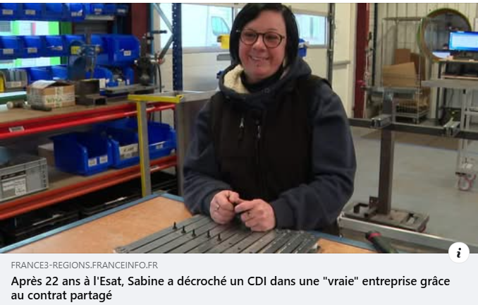 https://france3-regions.franceinfo.fr/pays-de-la-loire/mayenne/laval/apres-22-ans-a-l-esat-sabine-a-decroche-un-cdi-dans-une-vraie-entreprise-grace-au-contrat-partage-3285150.html?fbclid=IwY2xjawP2n99leHRuA2FlbQIxMQBzcnRjBmFwcF9pZBAyMjIwMzkxNzg4MjAwODkyAAEeXfhSk-Xf_rm_pJHwuu2yV3QnwMWpgtmgjGwkLCK2A9c_IahXDKn4SlKH5WY_aem_8ZKnwpRafpkY6xImG2aU_Q