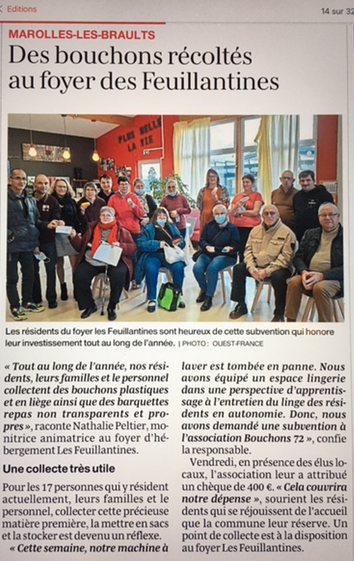 Des bouchons récoltés au foyer des Feuillantines à Marolles-les-Braults 26/01/2026 Publication Ouest France lundi 26 janvier 2026
